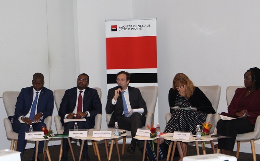 Aymeric Villebrun, DG de la Société Générale Côte d'Ivoire, entouré de ses collaborateurs à savoir Adama Ouattara, Directeur Général Adjoint des Ressources Humaines, Marc Giugni, Directeur Général chargé de la clientèle Entreprises, Ludivine Hubert, Directeur Général Adjointe chargée des affaires financières et juridiques institutionnelles et Joyce Sagoe, Directrice Marketing et Communication. Selon lui, l'objectif de cette rencontre était de présenter les performances de son entreprise.
