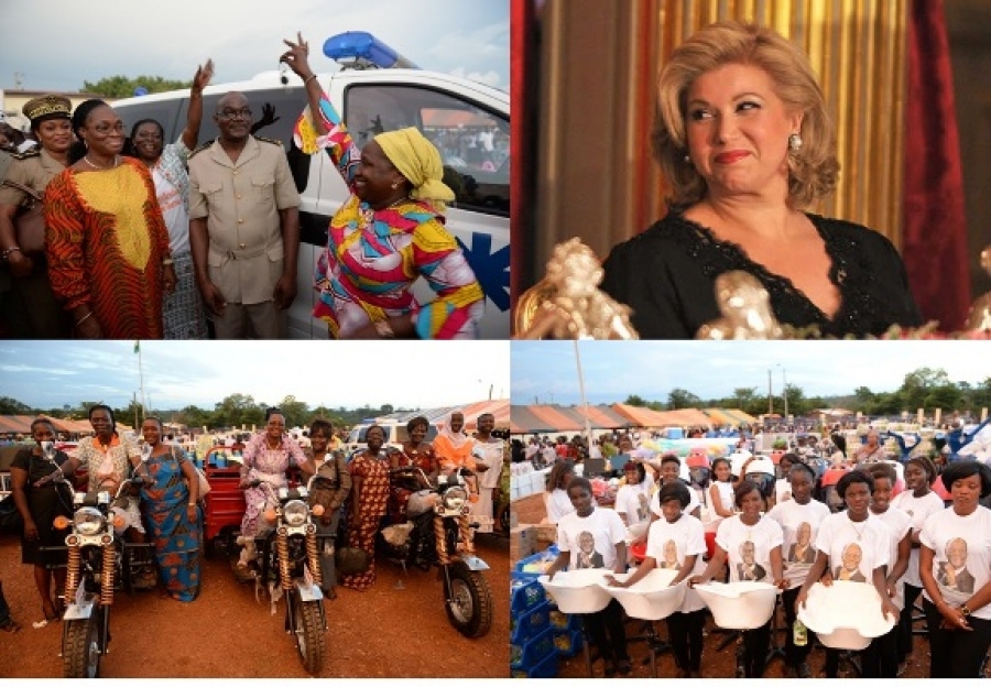 Les nombreux dons de la Première Dame ont littéralement inondé la cours de la préfecture. D’une valeur globale de 145 millions F CFA, ces dons prennent en compte plusieurs domaines de vie des populations d’Akoupé. Ainsi, la Première Dame a offert du matériel agricole aux coopératives et groupements de femmes. En effet, grâce à ces équipements, les coopératives et groupements de femmes exerçantes dans l’agriculture pourront désormais augmenter leur productivité. A cet effet, elles ont reçu 1 tracteur agricole ; 4 motobagages ; 6 décortiqueuses de riz et maïs et broyeuses de farine de maïs et manioc ; 100 presseuses de manioc et bien d’autres dons. Les restauratrices, les commerçantes, les coiffeuses et les couturières du département ont aussi, reçu des équipements pour booster leurs activités. Les foyers féminins ont également reçu des équipements. Dans le domaine de l’éducation, l’école maternelle du département a reçu des jeux extérieurs, des nattes et des tablettes pour enfants. Dans le domaine de la santé, la Première Dame a offert une ambulance à l’hôpital général d’Akoupé. Les centres de santé du département ont également reçu des équipements sanitaires en vue du renforcement de leurs plateaux techniques. En outre, la Première Dame a offert des couffins, des kits d’incitation à la consultation prénatale et des cartons de produits d’entretien pour bébé à ses différents centres. Il est impératif pour madame Dominique Ouattara que les futures parturientes fréquentent assidûment les maternités pour freiner la mortalité infantile et maternelle.